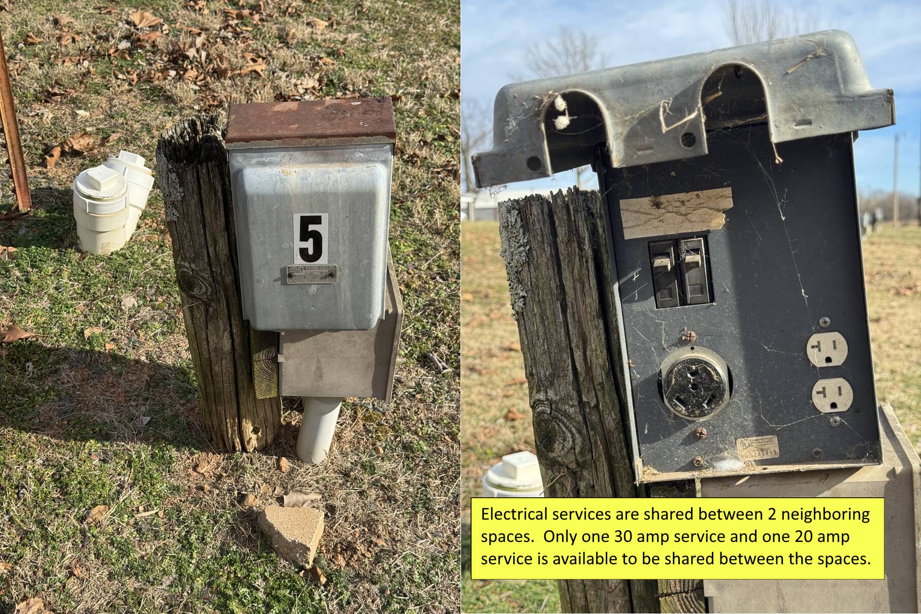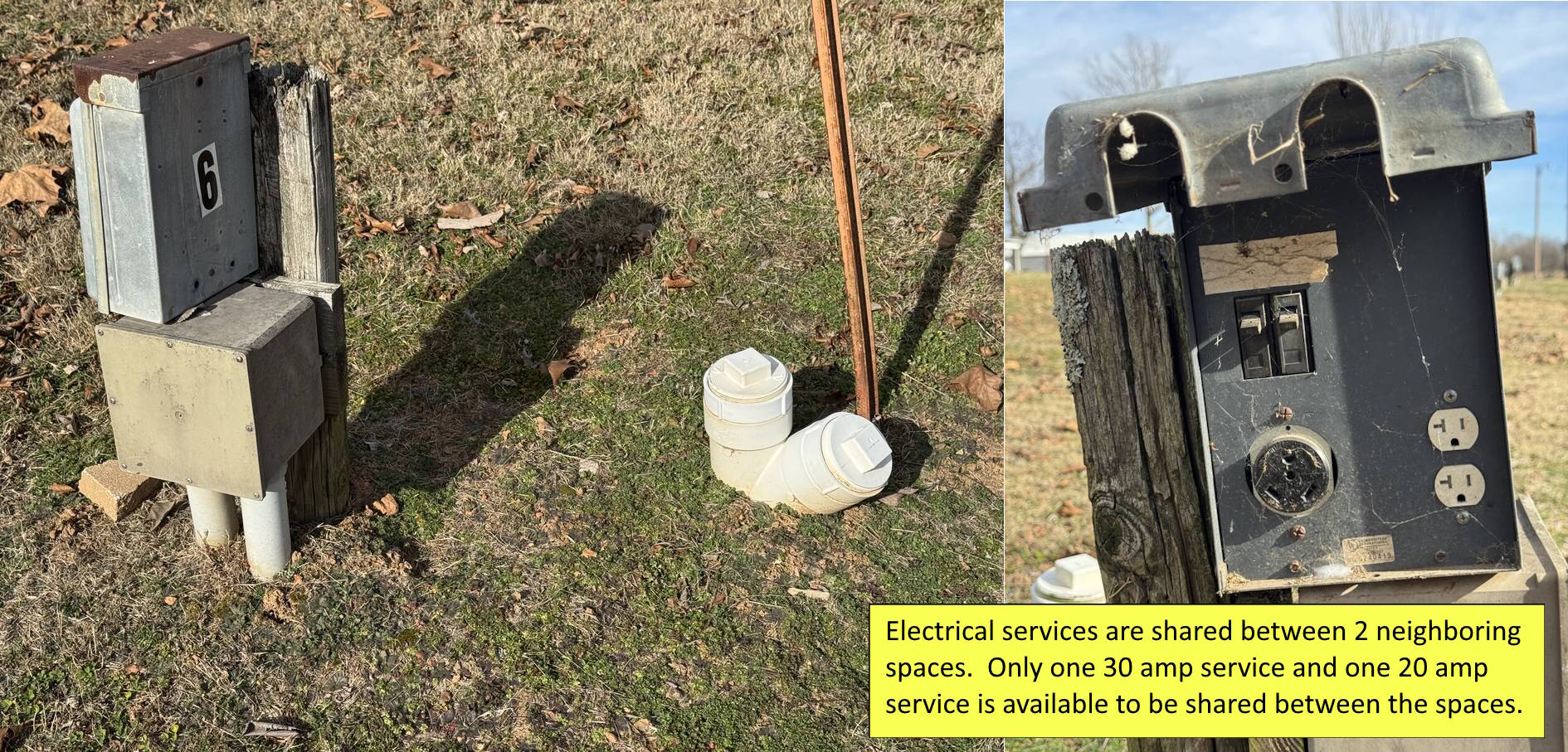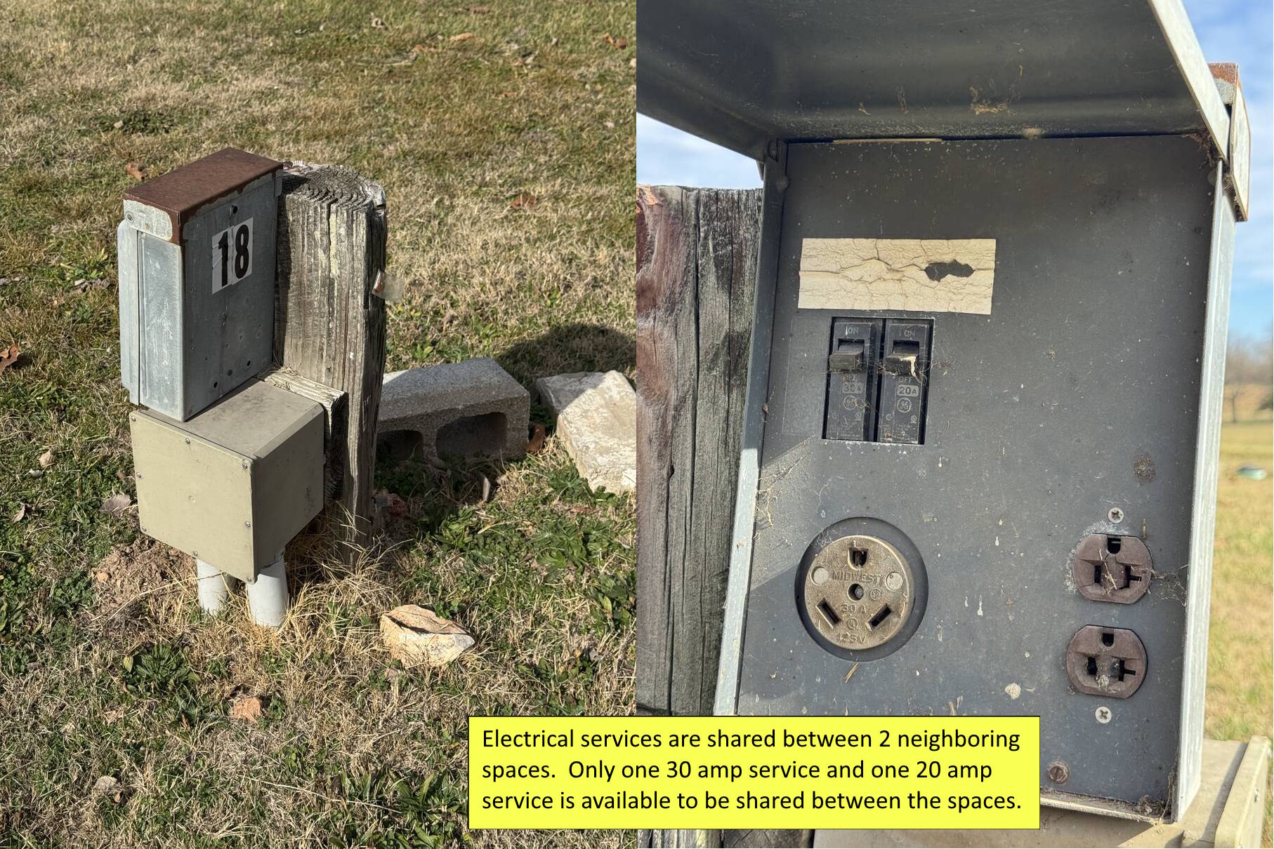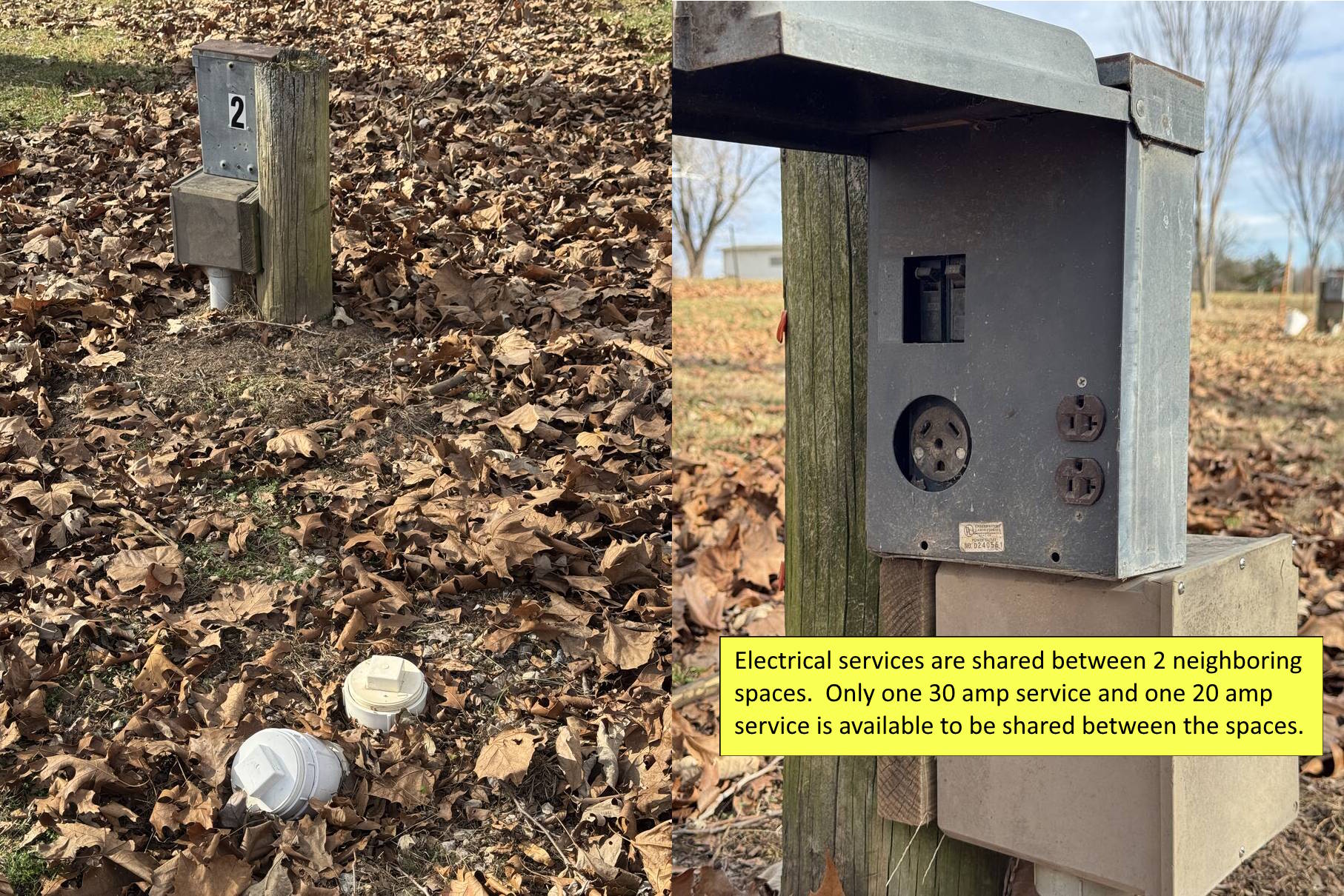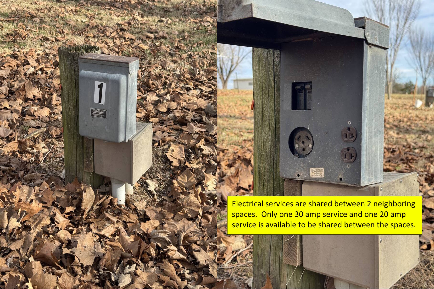 Lot A – RV Space – Shared 20A Elec. or 30A Elec. + Water/Sewer (1-6, 13-14, 17-30)