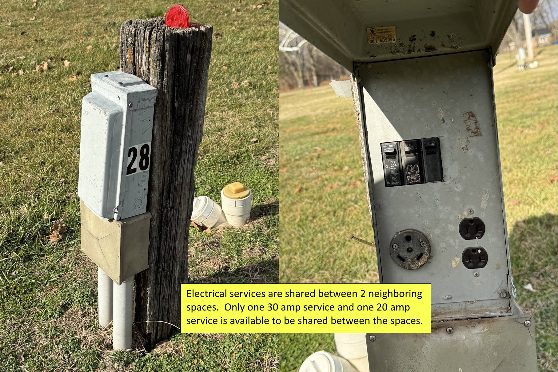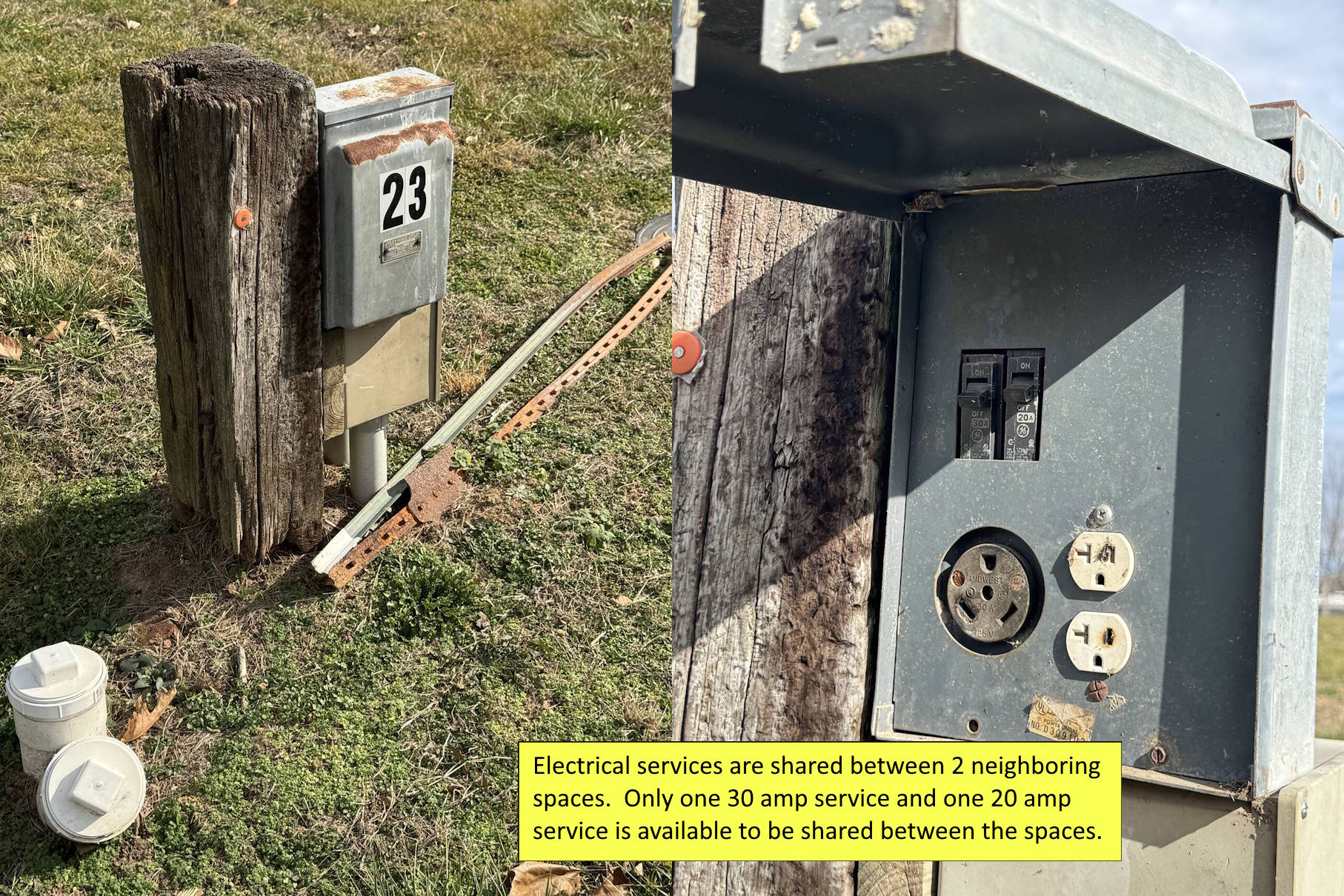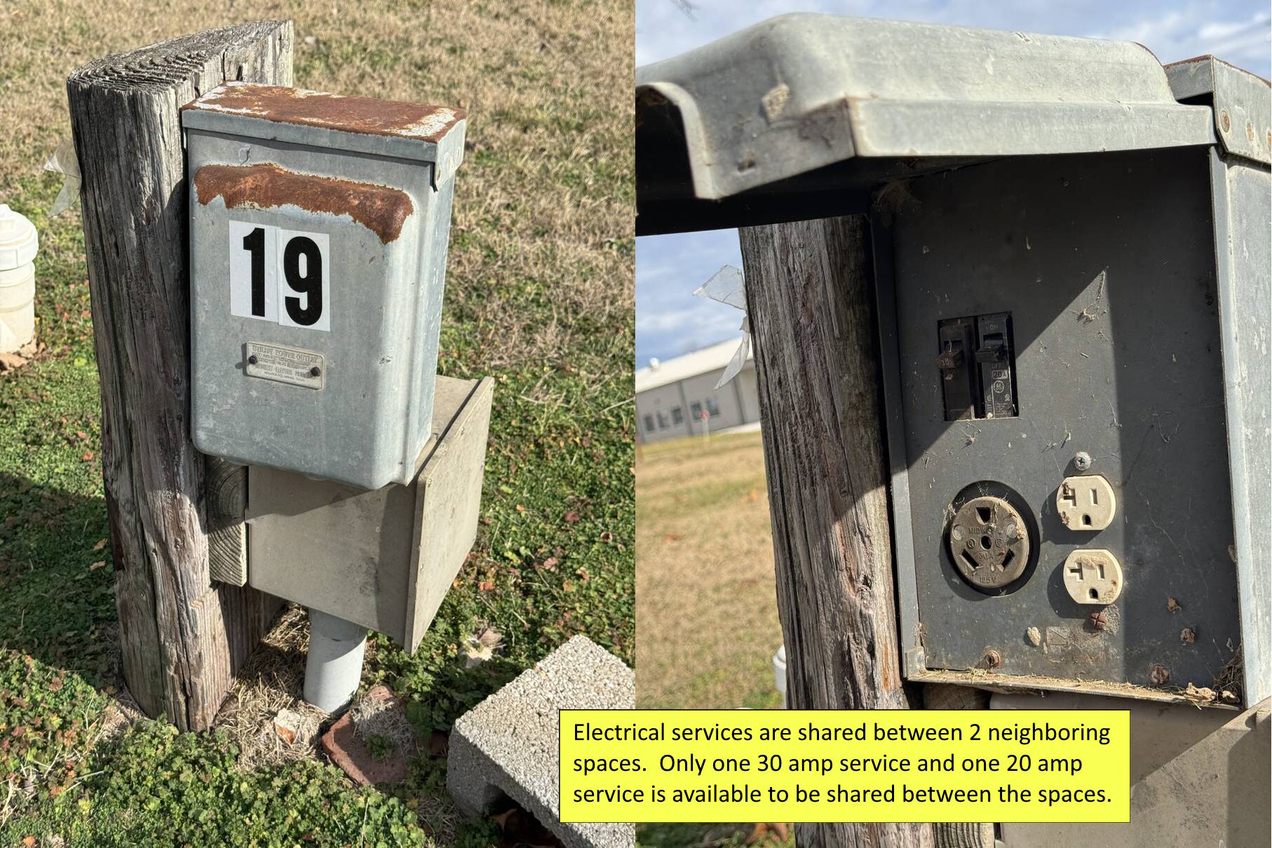 - 30-amp or 20-amp electrical service shared with neighboring space (Includes 30-amp 115v, and 20-amp 115v receptacles).